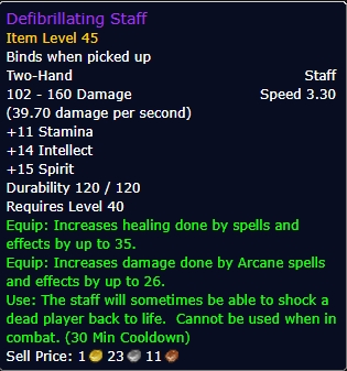 Among the two-handed weapons, the most exaggerated attribute is the Defibrillating Staff. If used by a mage, this weapon directly provides 61 spell damage and even resurrection!