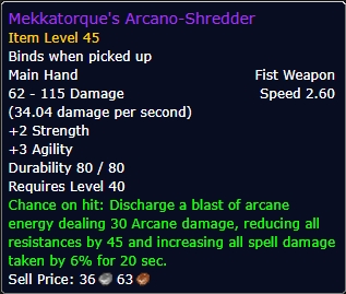 Of course, the "most terrifying" main-hand weapon is Mekkatorque's Arcano-Shredder, which provides 40 spell damage, 45 armor penetration, +6% spell vulnerability, and lasts for 5 minutes. This thing has attributes equivalent to orange gear!In the future, any melee player who gets their hands on these gloves in a raid will be extremely lucky!